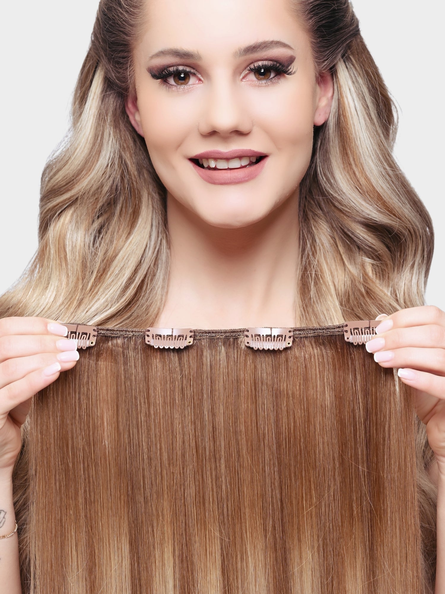 Ombré Clip in Extensions - luxury Qualität - 70 Gramm 3-teilig - 55cm - T17/20 ombré mittelbraun & äussersthellblond