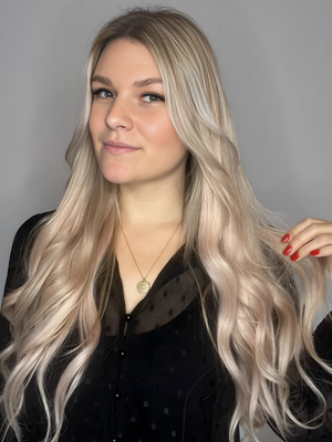 Bereits ein Set erfüllt das Volumen für eine Verdichtung oder Haarverlängerung. Erhältlich in einer grossen Farbvariation: Natural, gesträhnt sowie balayage Effekt.